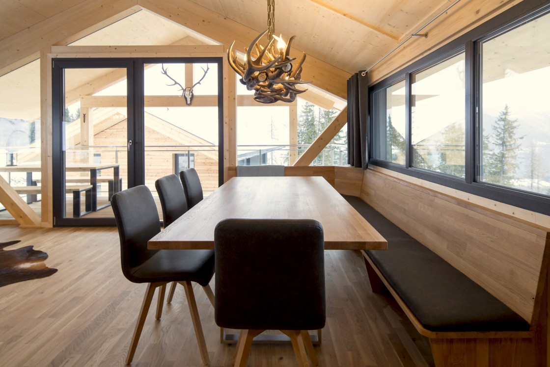 Hochwertige Designereinrichtung, vollausgestattete Küche und Schlafzimmer aus Vollholz, die nach individuellen Wünschen geplant sind, machen die Alpenchalets auf je ca. 120 m² für bis zu 10 Personen zu einem gemütlichen Rückzugsort mit traumhaftem Blick auf den Dachstein und auf Schladming.