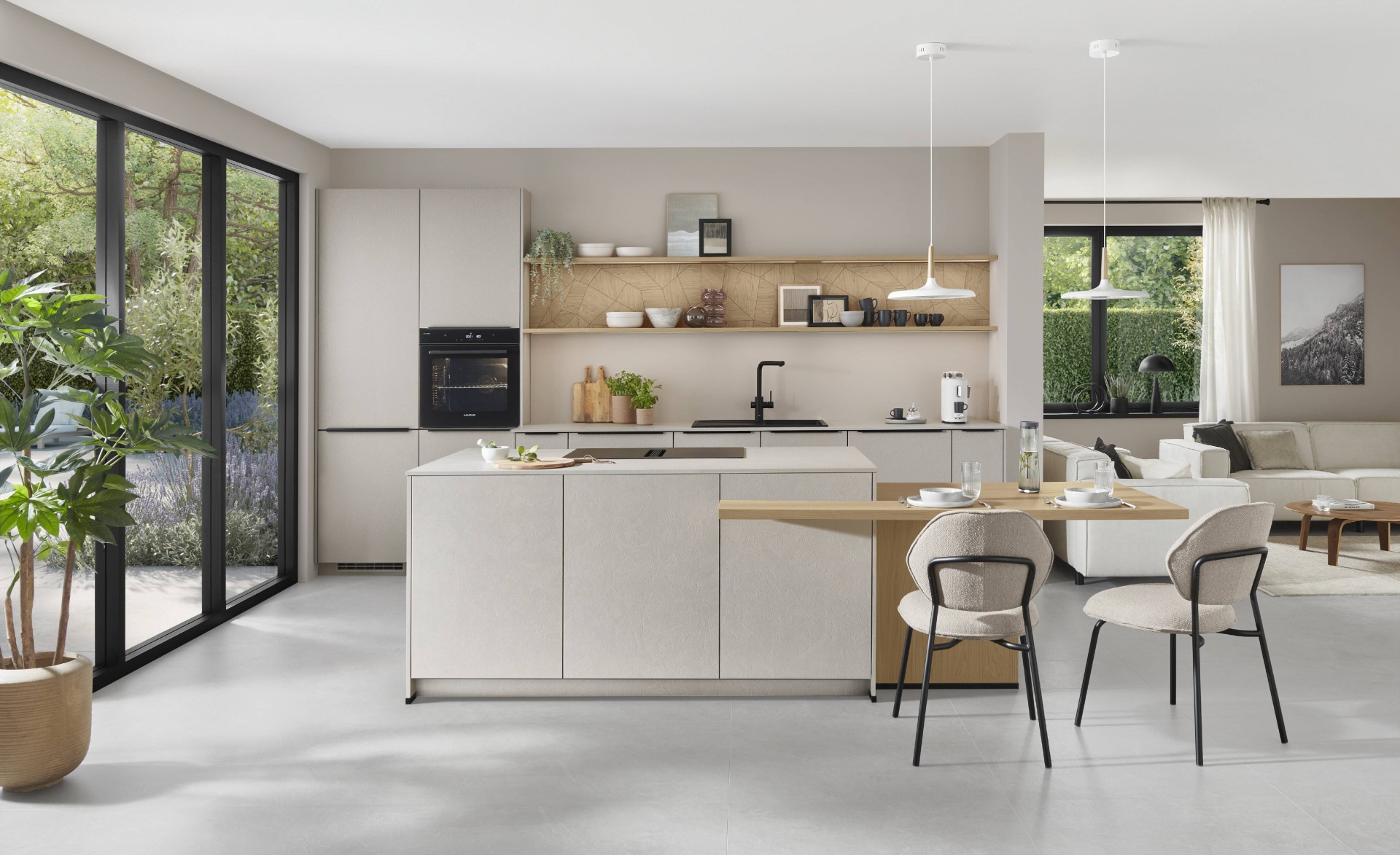 Ein eindrucksvolles Zusammenspiel, das visuell wie haptisch überzeugt: Der klare Sandton bringt Ruhe in den Raum, während die dezente Textur der Fronten eine subtile Lebendigkeit verleiht. Perfekt ergänzt durch die strukturierte Slim Line-Arbeitsplatte und die Nischenverkleidung in Eicheoptik entsteht ein harmonisches Gesamtbild aus natürlichen Tönen und spannender Materialtiefe.