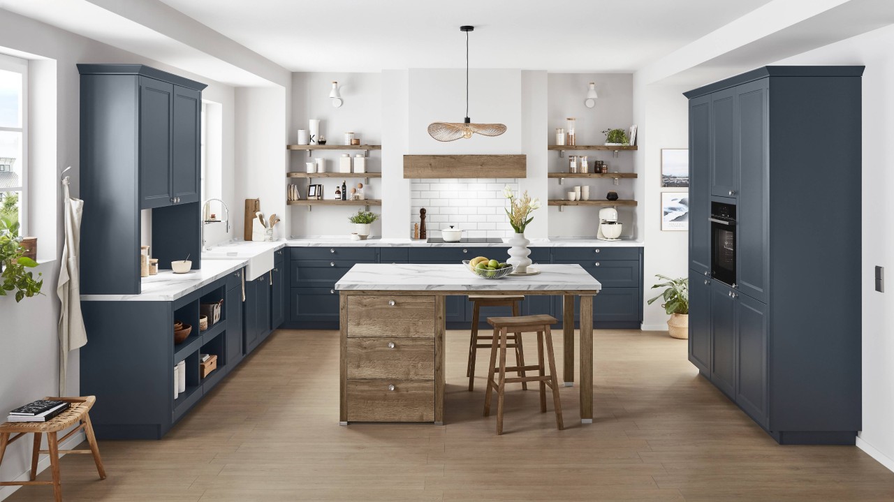 Die Küche ist der Ort, an dem alle zusammenkommen, um in entspannter Atmosphäre zu kochen, zu genießen und gemeinsam Zeit zu verbringen. Fjordblau gibt dabei den Ton an– ruhig, modern und mit ganz viel Gemütlichkeit. Die helle Arbeitsplatte in Marmor-Nachbildung bildet einen stilvollen Kontrast zur Front und unterstreicht das elegante Gesamtbild. Rund um die praktische Kücheninsel ist viel Platz für kreative Kochsessions – ideal zum Teilen besonderer Momente.